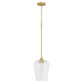 The aged brass finish of this pendant light exudes a warm, luxurious glow that enhances any room's ambiance. Its golden hue complements a wide range of color schemes, making it a versatile choice for different decor styles. The clear glass shade allows the light bulb to be the focal point, adding an element of transparency and elegance to the fixture.