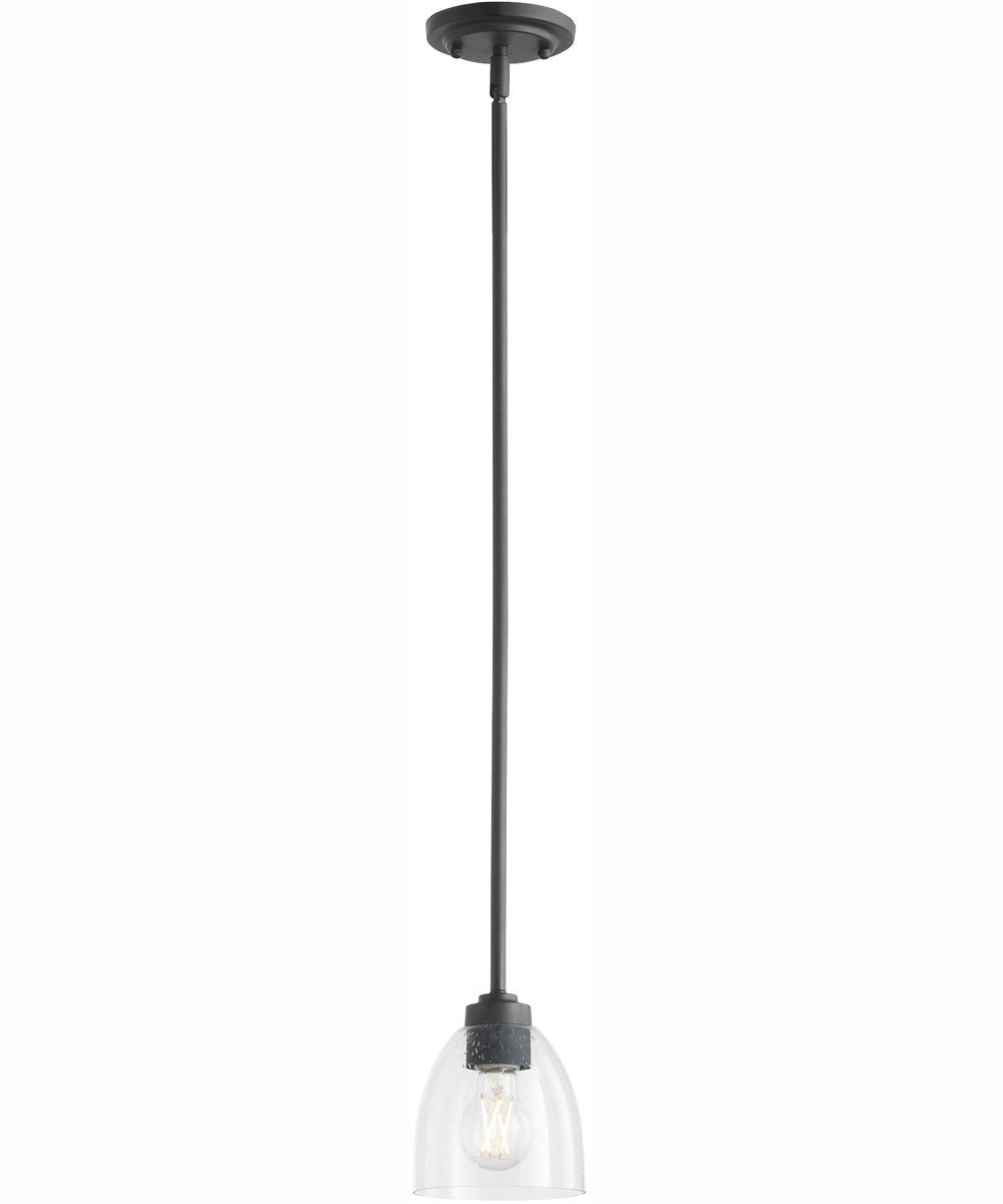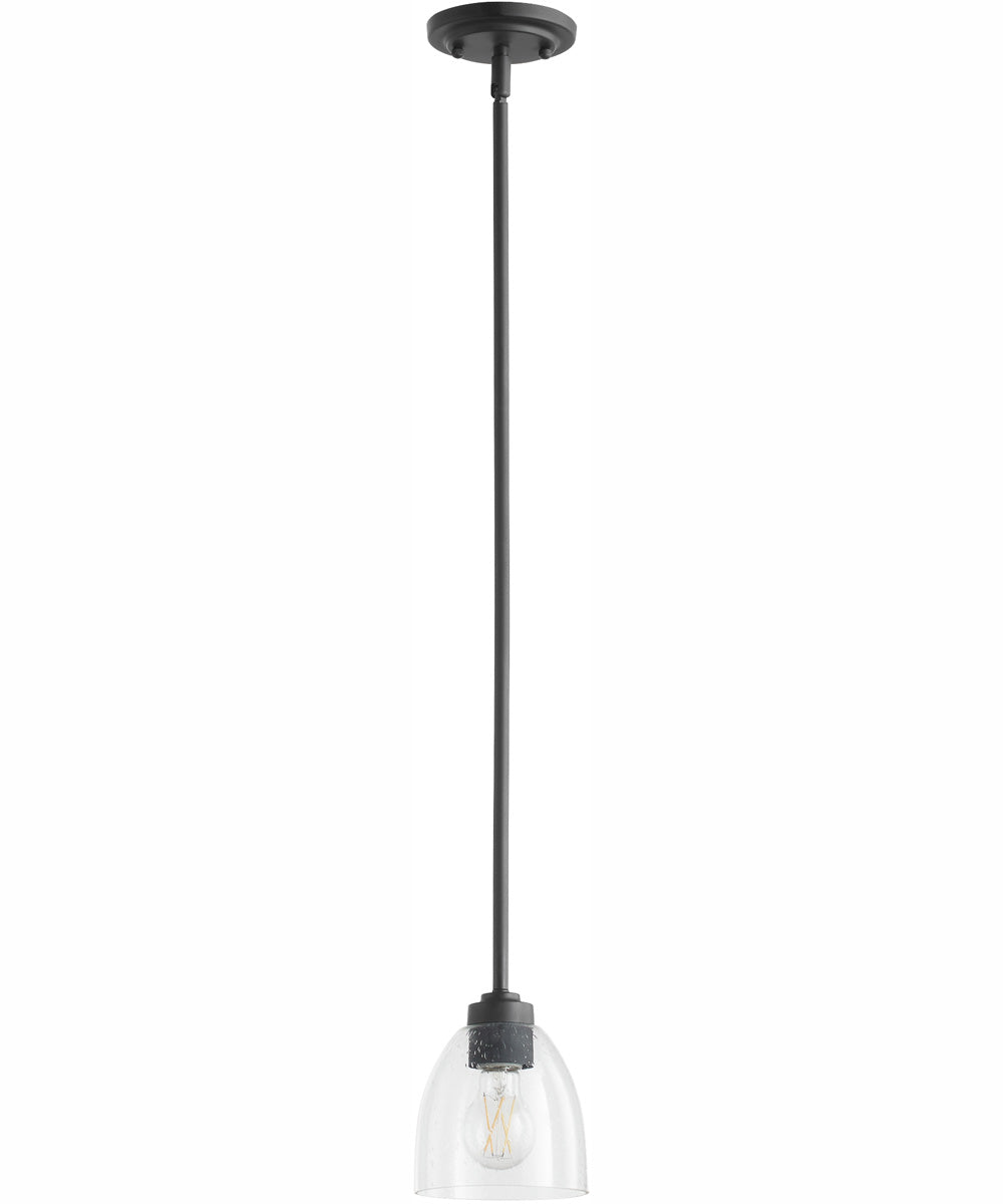 Introducing the Reyes 1-light Pendant in Textured Black – a perfect blend of style and functionality that will elevate the ambiance of any room. This pendant light, designed by Quorum, brings a touch of transitional elegance to your home or office. Its sleek and modern design is complemented by a clear seeded shade, creating a stunning visual effect when illuminated.
