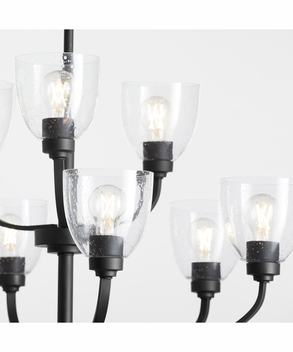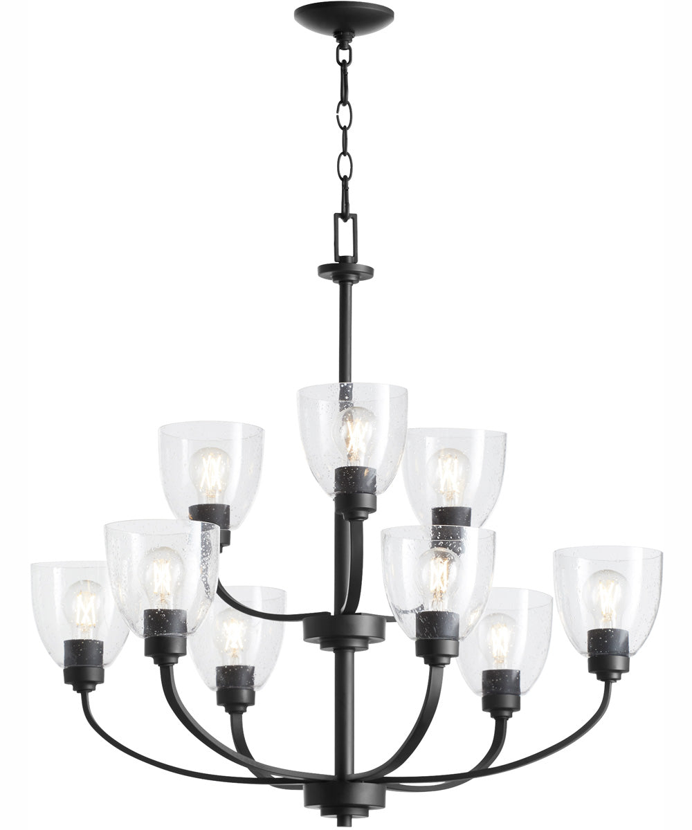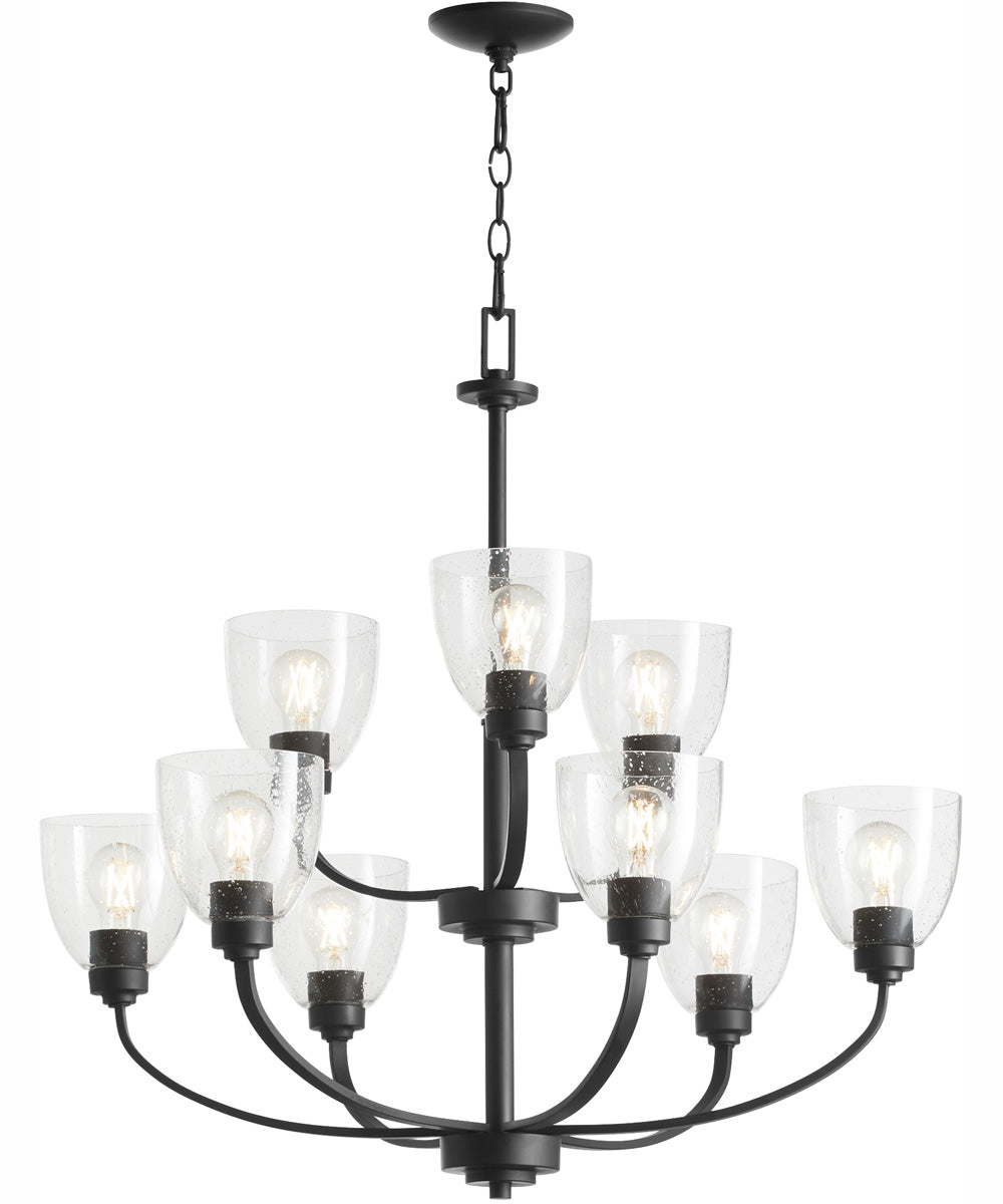 Recap: The Reyes 9-light Chandelier features a textured black finish, clear seeded shades, and a transitional style. Ideal for dining rooms, living rooms, entryways, and bedrooms, it offers both elegance and functionality. Easy to install and maintain, this chandelier is a must-have for any stylish home or office.