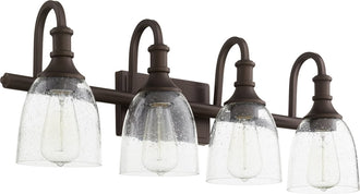 Transform your bathroom with the Richmond 4-light Bath Vanity Light in Oiled Bronze with Clear Seeded finish. Its elegant design, superior craftsmanship, and practical features make it a must-have for any stylish bathroom. Don't miss out on the opportunity to elevate your space with this exquisite lighting fixture. Order now and enjoy the perfect blend of form and function in your home.