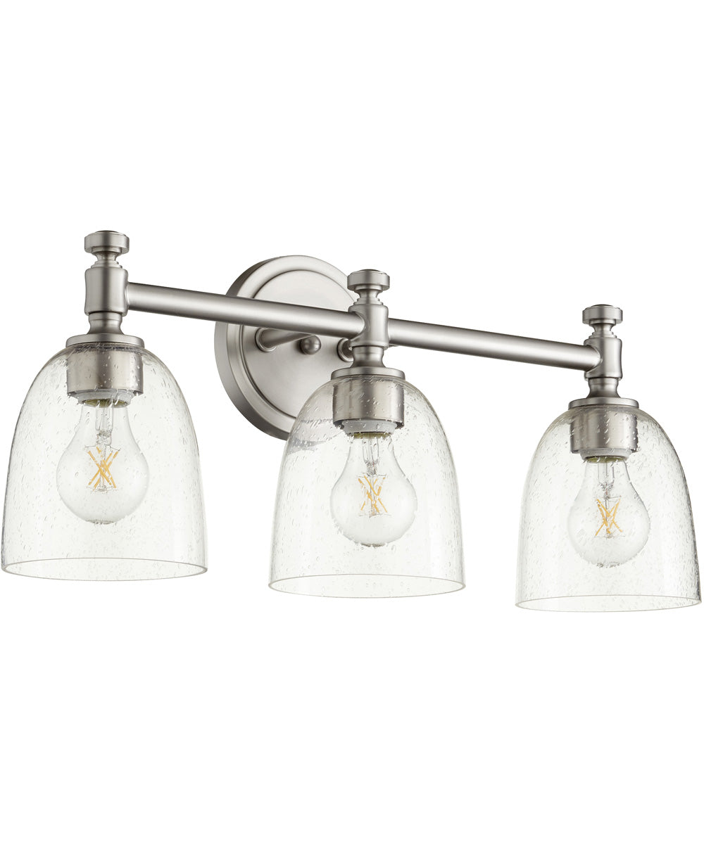 Picture this 3-light Bath Vanity Light in your home or office. Refresh your room with this Satin Nickel w/ Clear/Seeded-finished Bath Vanity Light by Quorum.