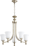 This chandelier is designed to accommodate five 60-watt medium-base bulbs (not included), providing ample lighting for your space. The Satin Opal shades diffuse the light beautifully, creating a warm and welcoming ambiance. The chandelier is part of the Rossington collection by Quorum, known for its exceptional craftsmanship and design. It is UL listed for dry conditions, ensuring safety and reliability. With a weight of 16 lbs, it is sturdy and durable, promising long-lasting performance.