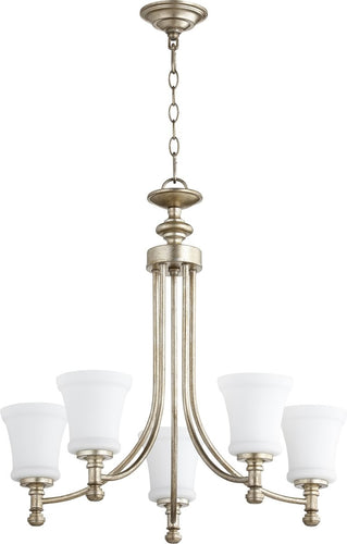 Transform your living space with the exquisite 25"W Rossington 5-light Chandelier in Aged Silver Leaf. This chandelier is a perfect blend of elegance and functionality, designed to enhance the aesthetic appeal of any room. The Aged Silver Leaf finish exudes a timeless charm, making it a versatile addition to both contemporary and traditional interiors. The chandelier features a transitional style that seamlessly integrates with various decor themes, adding a touch of sophistication and grace.