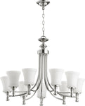 Transform your living space with the exquisite 31"W Rossington 9-light Chandelier in Polished Nickel. This stunning chandelier by Quorum is designed to captivate and illuminate, making it a perfect centerpiece for any room. The transitional style effortlessly blends classic and contemporary elements, ensuring it complements a wide range of interior décor themes.