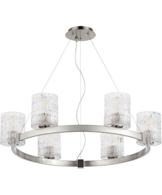 Introducing the Stadium 6-light Chandelier in Satin Nickel, a stunning centerpiece that will elevate the ambiance of any room. This chandelier features a sleek, modern design with a circular frame finished in a sophisticated satin nickel. The six lights are encased in beautifully textured glass shades, adding a touch of elegance and refinement to the overall aesthetic. The combination of the satin nickel finish and the intricate glass shades creates a harmonious blend of contemporary and classic styles, making it a versatile addition to various interior themes.