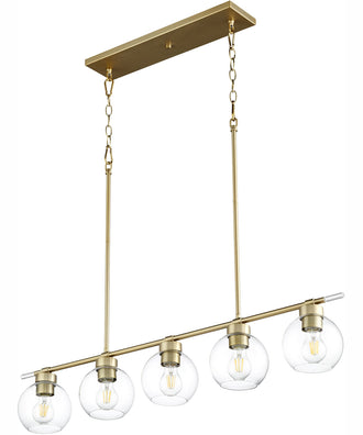 The Volan 5-light Pendant features a sleek, linear design that exudes contemporary charm. Its aged brass finish adds a touch of vintage allure, creating a harmonious balance between old-world sophistication and modern minimalism. The pendant is adorned with five clear glass shades, each housing a medium-base bulb, which enhances its aesthetic appeal while providing ample illumination. The clear shades allow the bulbs to shine brightly, casting a warm and inviting glow throughout the room.