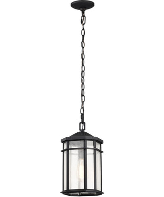 The Raiden 1-Light Outdoor Matte Black Hanging Light from Nuvo Lighting is a perfect blend of classic elegance and modern sophistication. Its sleek, matte black finish adds a touch of contemporary charm, while the clear seeded glass panels bring a vintage appeal that complements various architectural styles. The cylindrical shape, combined with the geometric lines of the die-cast aluminum frame, creates a timeless design that enhances the aesthetic of any outdoor space.
