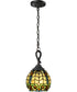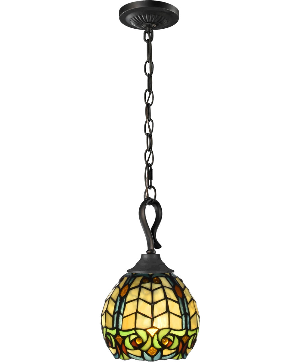 Our pretty Raphael Mini Pendant Lamp features a Baroque look that will easily assimilate into any decor style. The pendant features a dome shade with a background of sunny light amber set in a fashion that creates a three-dimensional illusion. Vertical bands of amber, green and blue extend down and outward to create an interwoven vine around the shade's bottom. We added amber art glass gems throughout the bottom for added texture, color, and sparkle when the pendant is illuminated. Raphael hangs beautifully from a round metal ceiling canopy, wire cable/chain and vase cap that are finished in Antique Bronze which perfectly complements the colors in the shade. A pretty way to light an occasional table or vanity, try hanging our Raphael Mini Pendant Lamp in multiples over a kitchen island or breakfast nook for an extra special look you will enjoy for years to come. NOTE: Due to the nature of handmade art glass, colors, sizes and patterns may vary slightly.