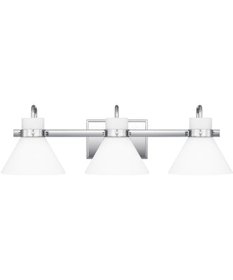 The Regency bath light gets its warm, milky glow thanks to opal-etched shades. Radiate crisp and classic style in the polished chrome finish or choose weathered brass for a nod to vintage-inspired refinement. The light can be affixed with shades pointed up or down.