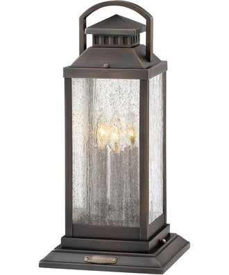 The Revere 3-Light Medium Pier Mount Outdoor Lantern in Blackened Brass by Hinkley is a sophisticated addition to your exterior decor. This lantern boasts a timeless design that blends traditional charm with modern elegance, making it a versatile piece for various outdoor settings.