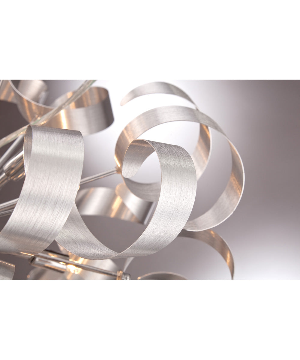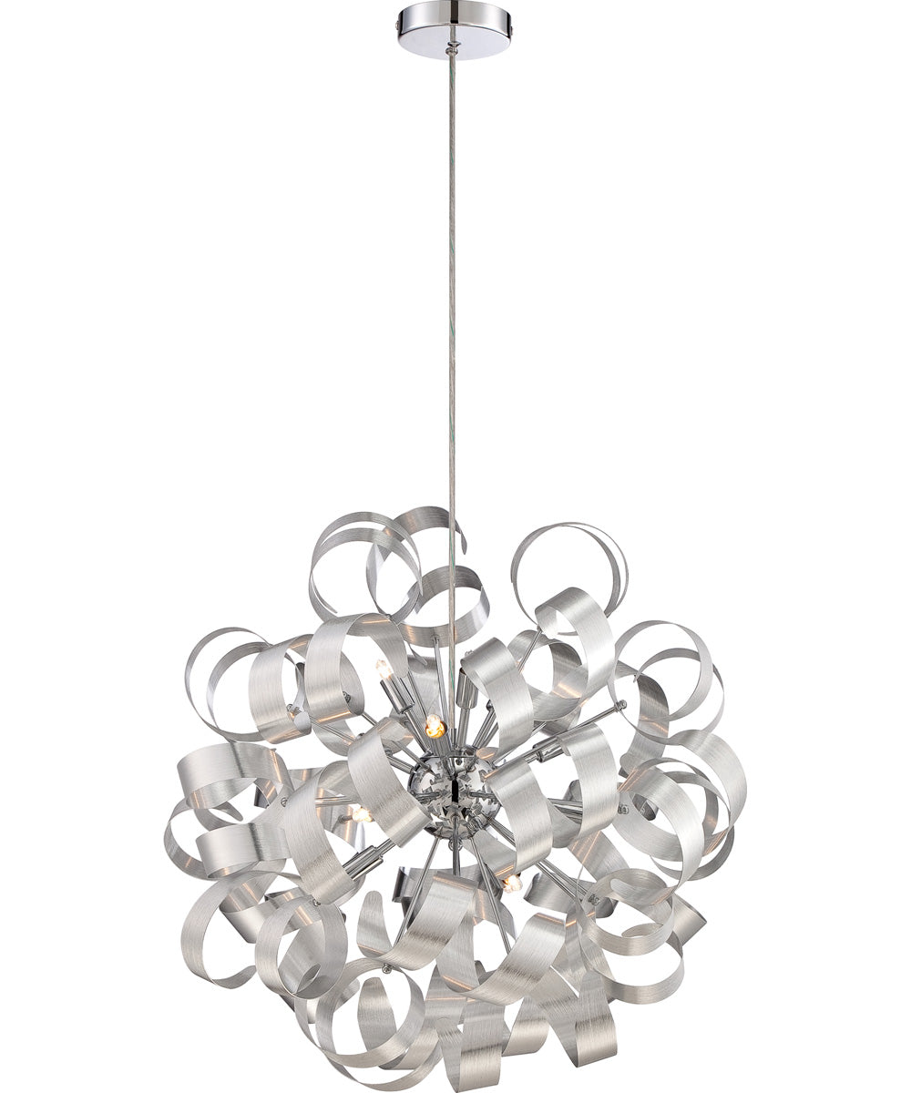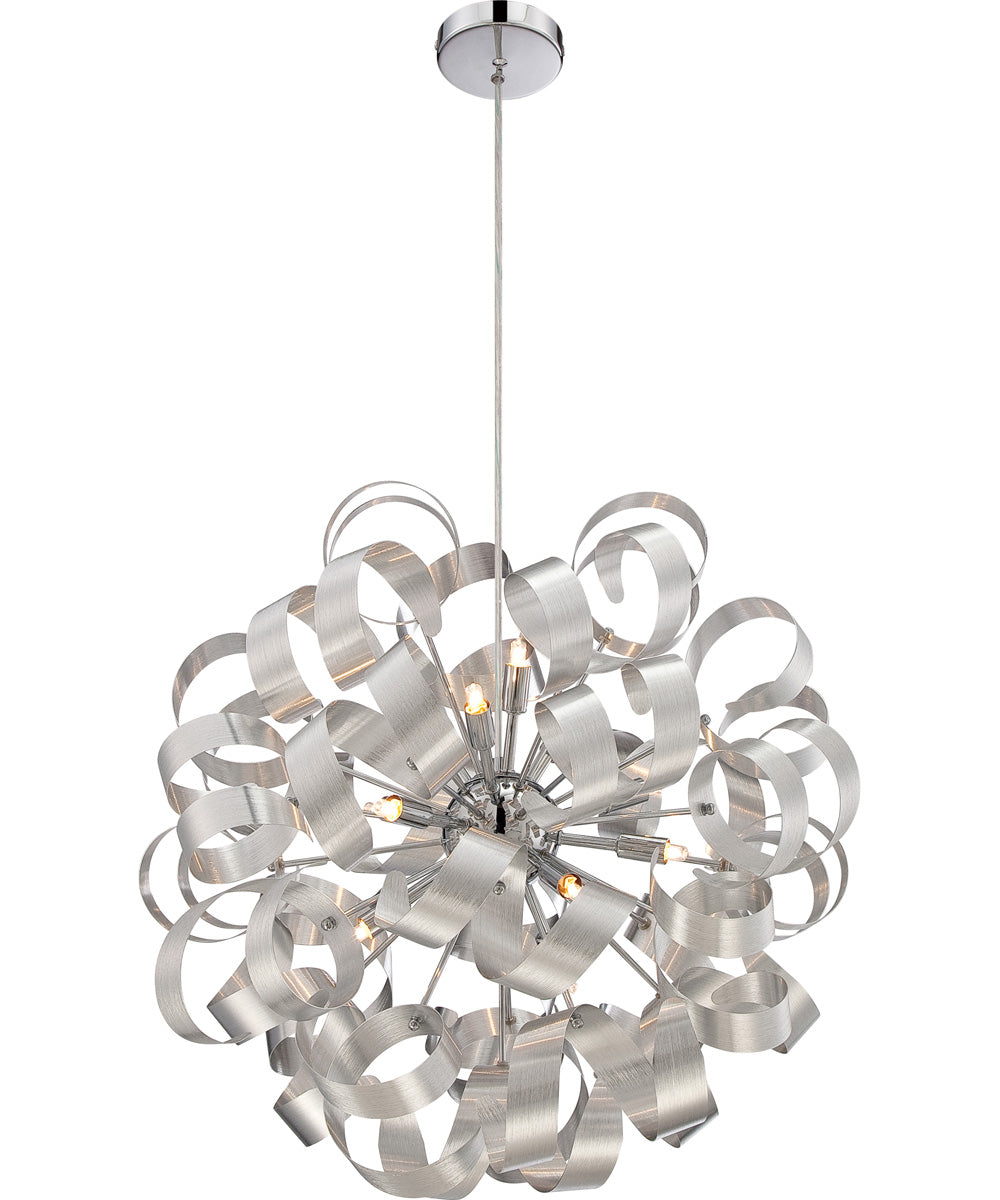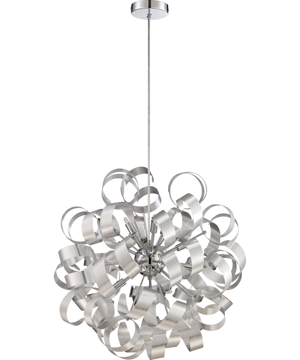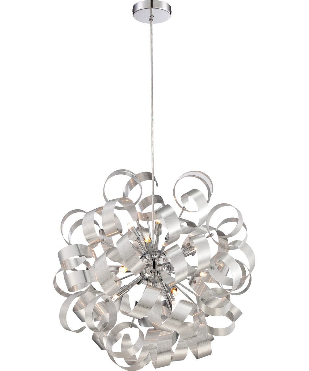 The Ribbons 12-light Pendant in Millenia finish by Quoizel is a true masterpiece of contemporary lighting design. This stunning pendant light is part of the Platinum Collection, which is known for its trendsetting and forward-thinking aesthetics. The unique swirling pattern of the Ribbons collection is both captivating and elegant, making it a perfect centerpiece for any modern space.