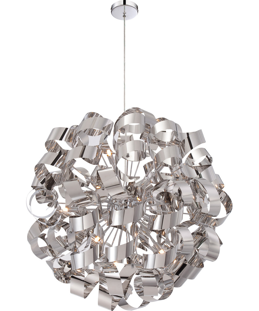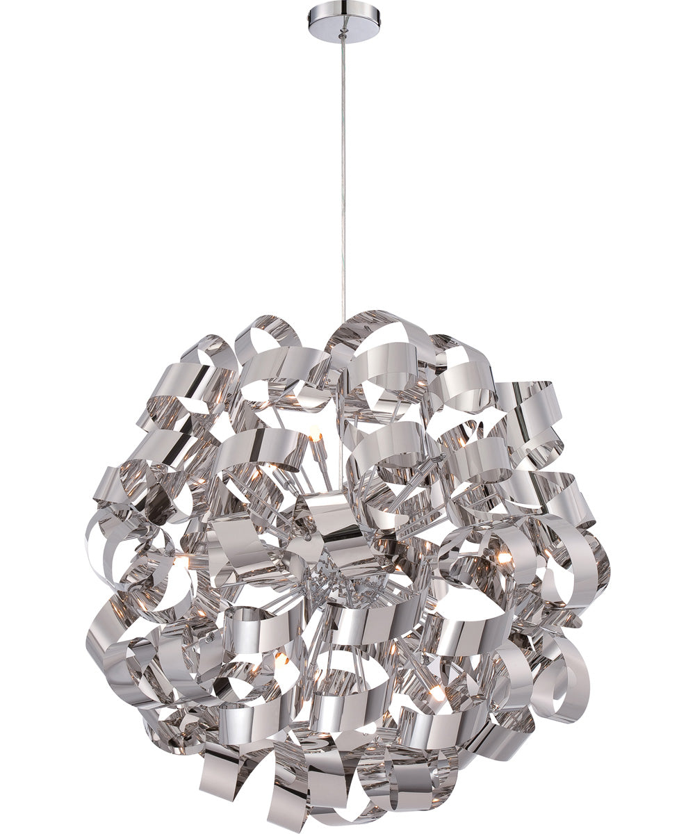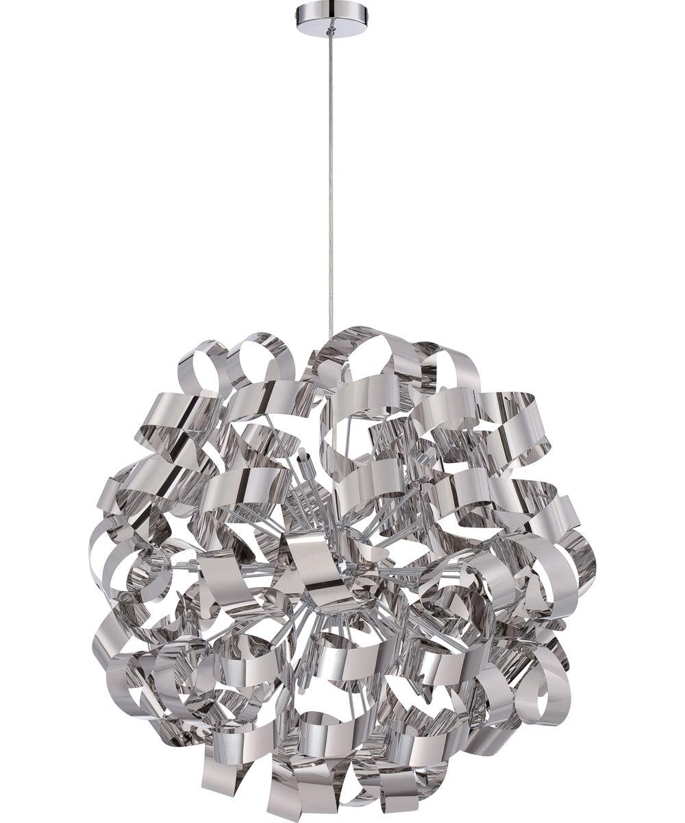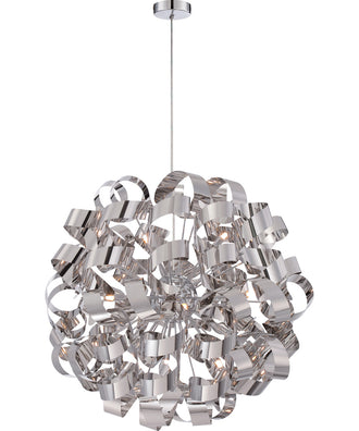 The Ribbons 12-light Pendant in Polished Chrome by Quoizel is a stunning centerpiece for any modern or contemporary space. This exquisite lighting fixture is part of the Platinum Collection, renowned for its trendsetting and forward-thinking designs. The pendant light features a captivating swirling pattern that resembles an intricate dance of ribbons, making it a unique and eye-catching addition to any room.