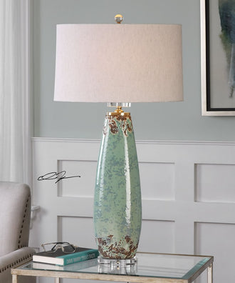 Crackled, Pale Mint Green Ceramic With Gray Distressing And Rust Undertones Accented With Brushed Nickel Details And A Crystal Foot. The Slightly Tapered Oval Hardback Shade Is A Light Beige Linen Fabric. Due To The Nature Of Fired Glazes On Ceramic Lamps, Finishes Will Vary Slightly.Uttermost's Lamps Combine Premium Quality Materials With Unique High-style Design.With The Advanced Product Engineering And Packaging Reinforcement, Uttermost Maintains Some Of The Lowest Damage Rates In The Industry. Each Product Is Designed, Manufactured And Packaged With Shipping In Mind.