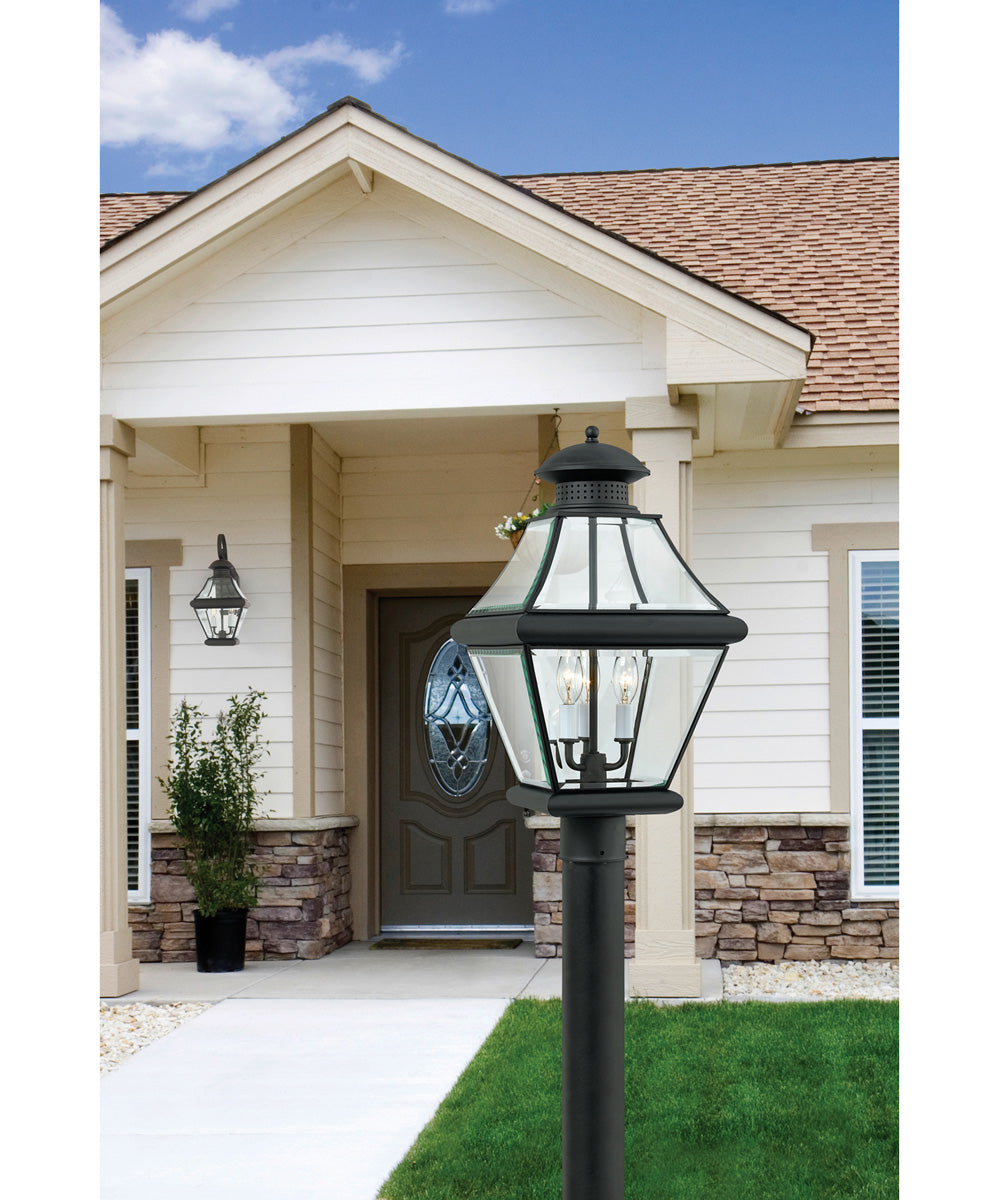 This outdoor lantern expresses simplicity of design. Clear beveled glass provides an unobstructed path for light to brighten your outdoor landscape. A deep mystic black finish completes the look.
