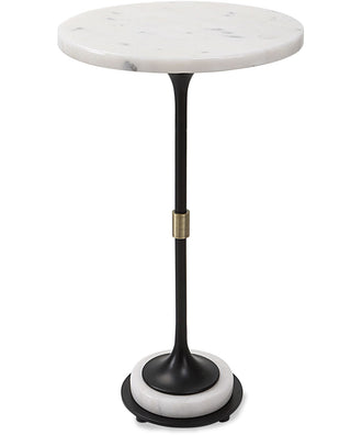 Sophisticated and stylish, this round accent is made from black iron with antique brushed brass accents. the top and foot feature polished white marble with natural gray veining.