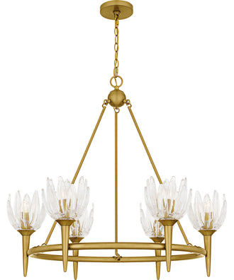 The Shea 6-light Chandelier in Brushed Gold is a stunning blend of traditional style and artistic elegance. This chandelier features handmade glass shades that resemble delicate flower petals, adding a touch of nature-inspired beauty to your home. The brushed gold finish provides a sophisticated contrast to the clear glass shades, creating a timeless piece that enhances any room's decor.