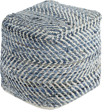 The blue/white textural finish of this hand-made pouf is produced with recycled demin. The shell features a zipper with 100% EPS beads filler. Spot clean only.