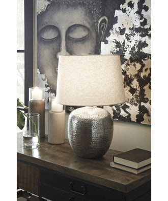 Introducing the 23"H Magalie Metal Table Lamp in Antique Silver, a stunning piece from Signature Design by Ashley. This exquisite lamp features a beautifully hammered aluminum base with an antique silver finish, bringing a touch of timeless elegance to any room. The modified drum shade complements the base perfectly, offering a soft, diffused light that creates a warm and inviting atmosphere.