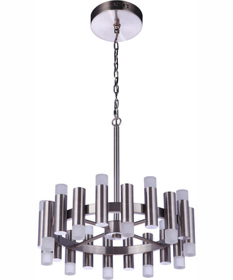 The Simple Lux Lighting Collection by Craftmade features brilliant dimmable LED light illuminating the frosted acrylic shades of this contemporary collection of 16", 20" and 27" diameter chandeliers and 12" diameter semi flushmount fixture. Sleek cylinders with frost LED caps alternating up and down surround the round frame suspended from a round canopy by a combination of rod and adjustable height chain. Damp Rated