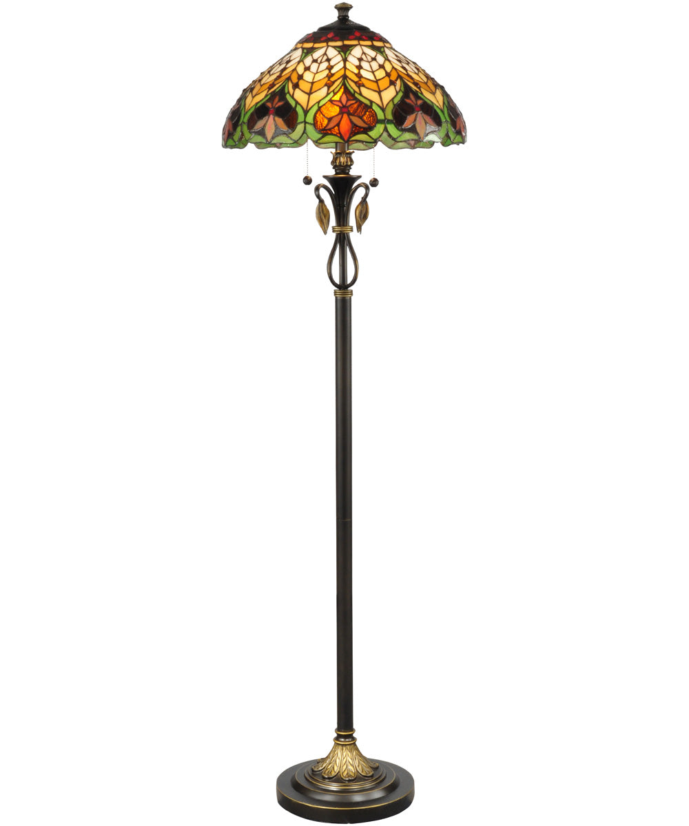 The Sir Henry Tiffany Floor Lamp is a masterpiece of design and craftsmanship, bringing a touch of tropical elegance to any room in your home. Standing at an impressive height of 60 inches, this floor lamp features a generously sized dome shade made from hand-rolled art glass. The lush green background of the shade is adorned with large, leaf-shaped panels of buttery amber, creating a warm and inviting ambiance. A cascading band of light and dark amber runs along the top of the shade, adding depth and dimension to the design.