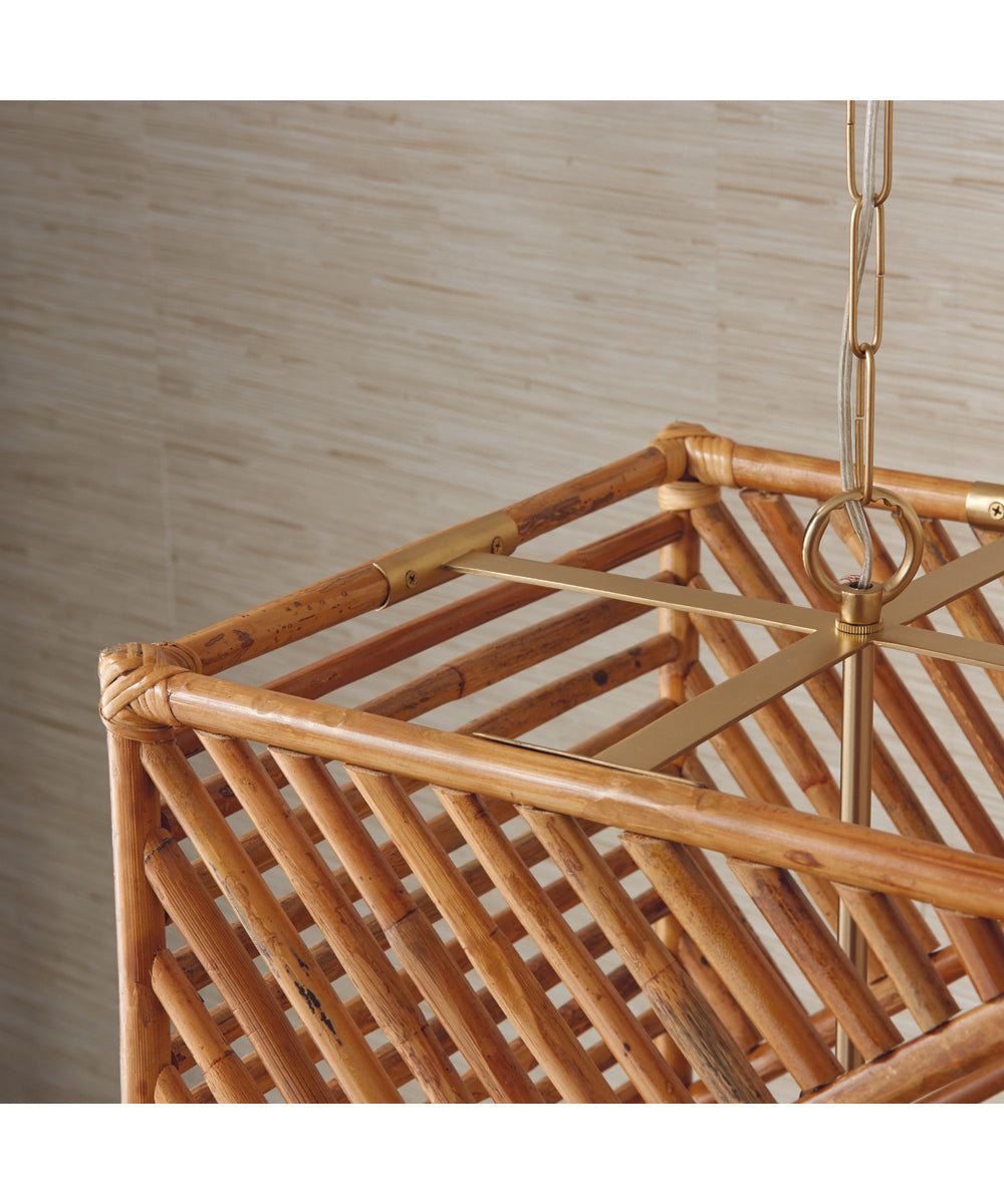 The light fixture boasts a matte brass finish, a light, honey-toned gold with a slightly shiny matte texture that is smooth to the touch. This finish complements the natural bamboo's warm, earthy tones, creating a harmonious balance between metal and wood.