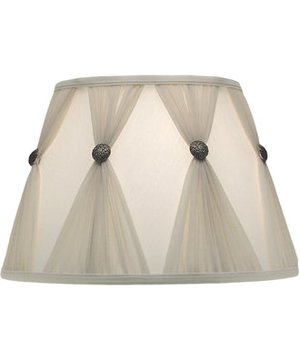 The 11x18x12 Ivory Shadow/Champagne Gathered Pleat and Whisper Pleats Boillotte Softback Lampshade exudes timeless elegance and sophistication. Its softback design is meticulously crafted with gathered pleats and whisper pleats, creating a delicate and refined look that enhances any room's ambiance. The bronze rosettes add a touch of vintage charm, making this lampshade a perfect blend of classic aesthetics and modern sensibilities.