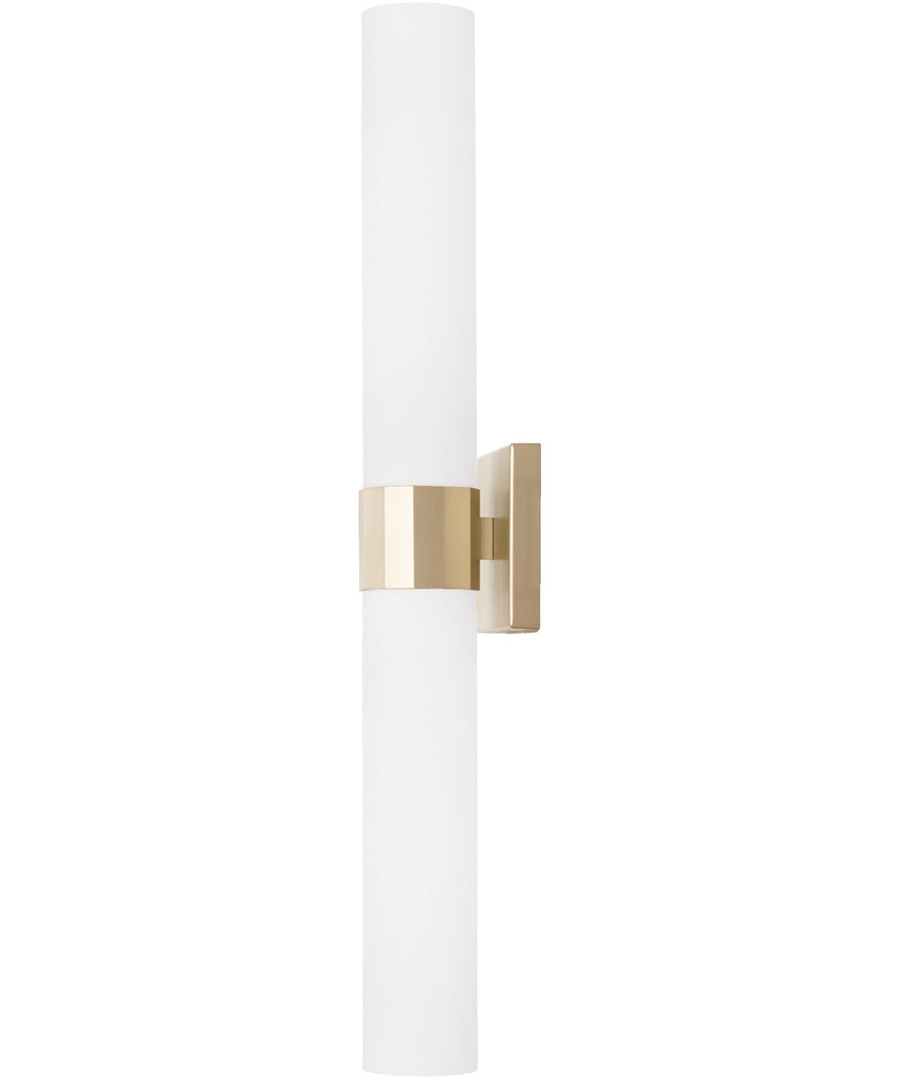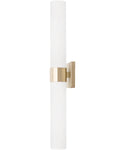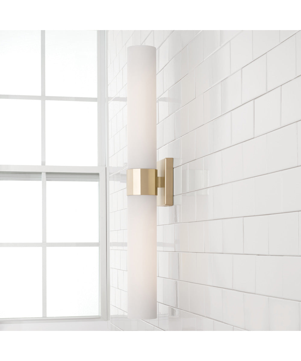 Sophisticated and stunning, the Sutton Dual Sconce puts a tailored touch on a simple form. The champagne sheen of Soft Gold faceted band anchors the two frosted glass shades for elevated elegance.