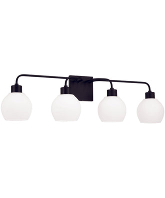 Inspired by mid-century design, the Tanner 4-Light Vanity for HomePlace is always on-trend and on-budget. The Matte Black finish and soft white glass complement the clean lines and retro style for a look that works with any design aesthetic. Also available in 2-Light or 3-Light.