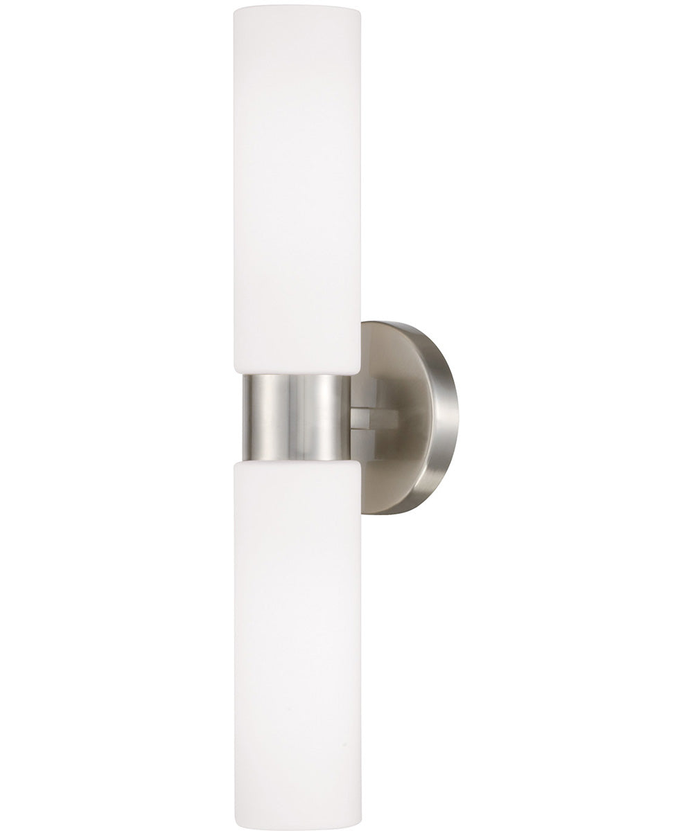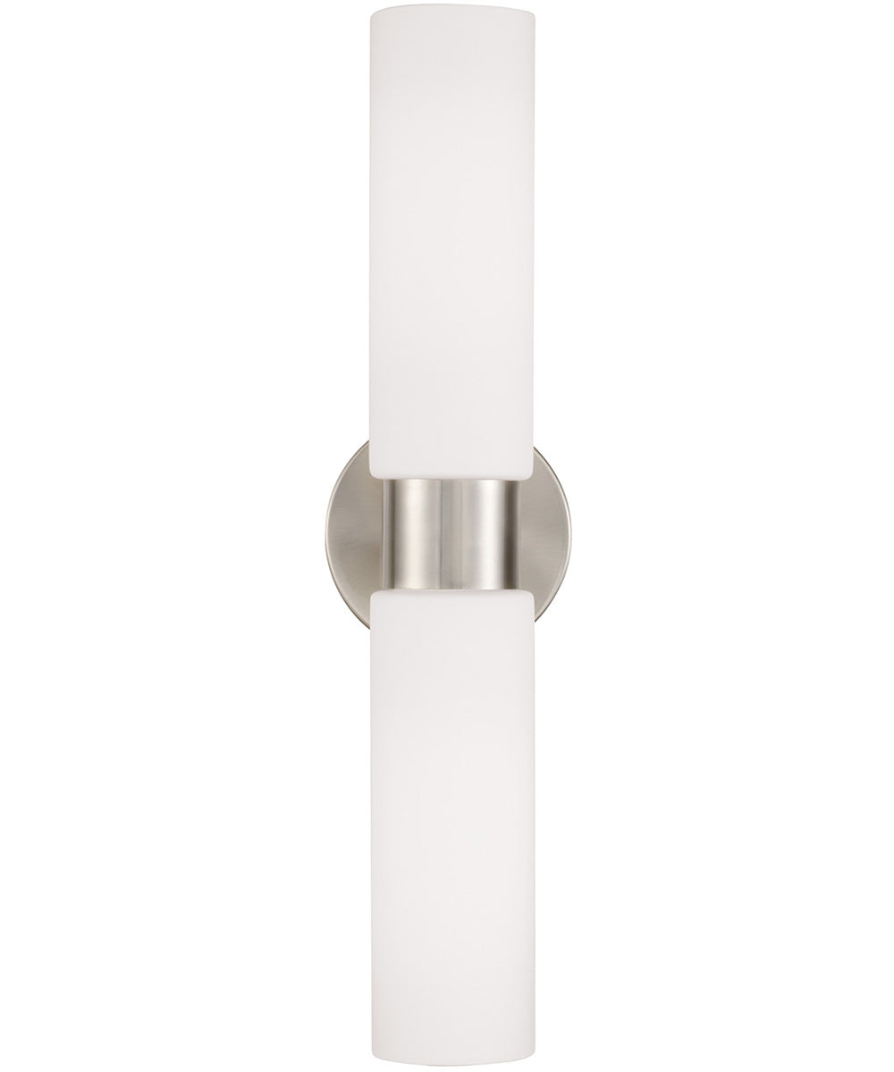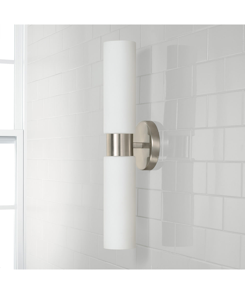 Sleek and classic, the Theo Dual Sconce for HomePlace punctuates any powder room. The Brushed Nickel finish adds a classic touch, while the elongated Soft White glass shades create a sophisticated glow.