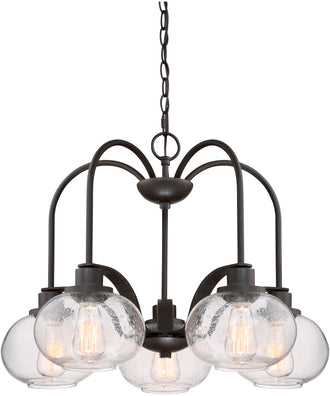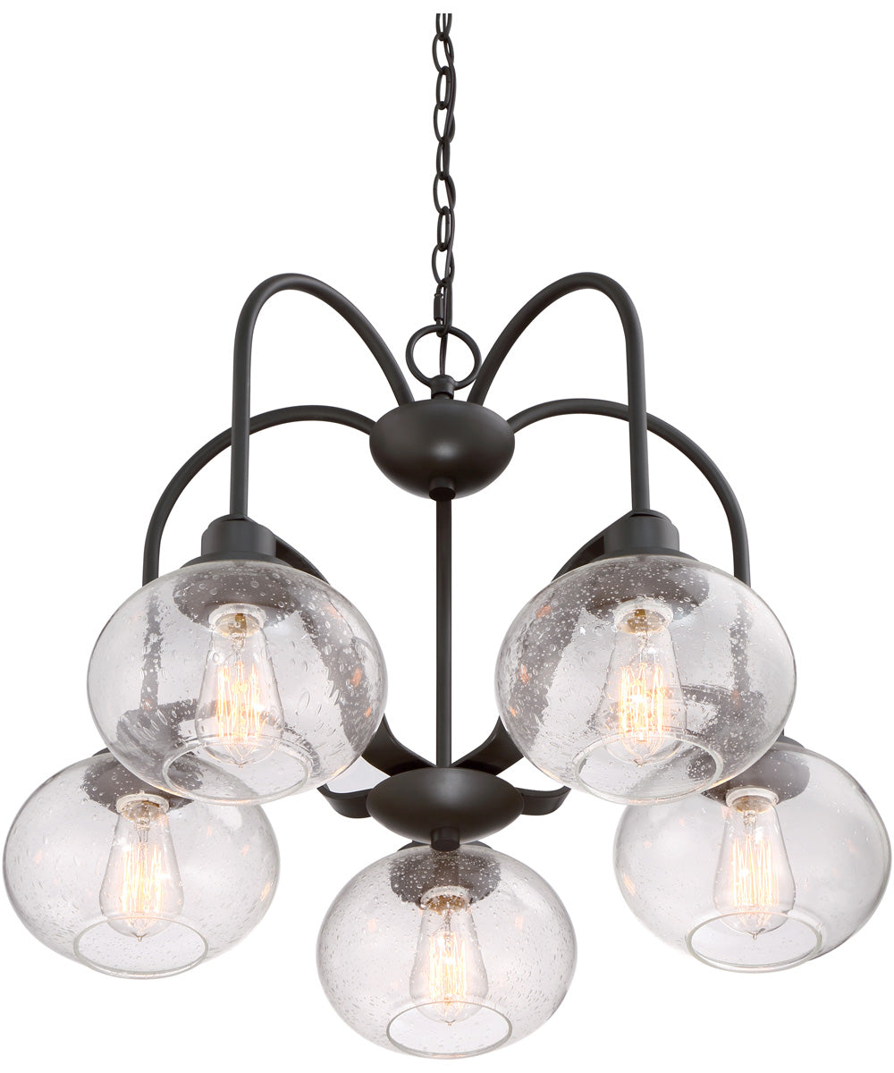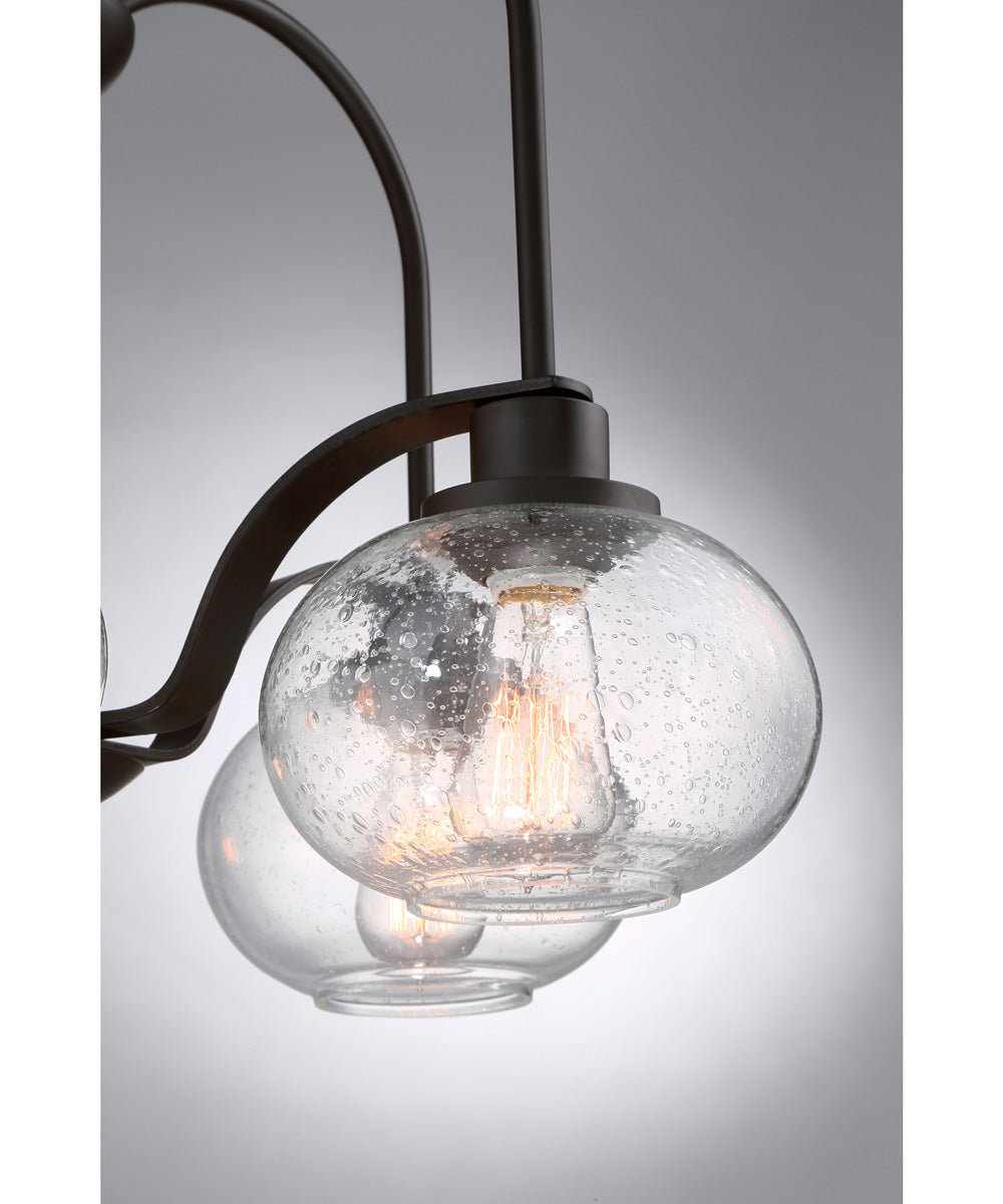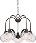 The Trilogy 5-light Chandelier in Old Bronze is a stunning homage to the vintage charm of Thomas Edison's era. This chandelier captures the essence of old-world style while seamlessly integrating it with modern elegance. Its old bronze finish exudes a rich, warm tone that adds a touch of sophistication to any space. The clear seedy glass shades provide a nostalgic yet chic look, allowing the filament bulbs to shine through beautifully.