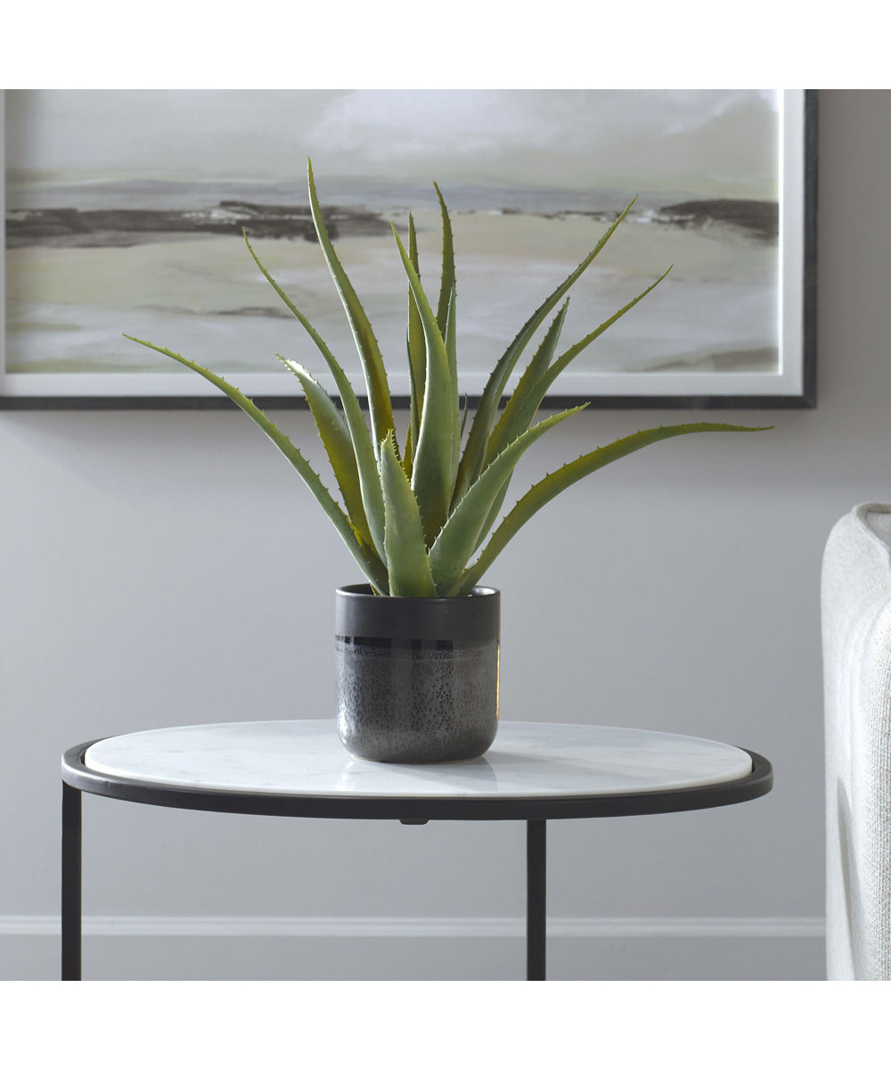 A contemporary ceramic pot with textured, matte and gloss glazes refreshes this aloe vera accent piece, placed over a bed of preserved moss.