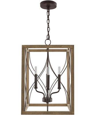 Wood and metal come together in this rustic 4-light foyer fixture designed to infuse farmhouse character. A square frame crafted of wood in a distressed finish is accented with a stylized, geometric motif, pairing clean lines with curves. Try this foyer light as a pendant fixture above the kitchen island or in a hallway for impact-making style.