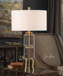 Stacked Clear Glass Columns With A Hammered Texture, Displayed With Antique Brass Plated Steel Details. The Round Hardback Drum Shade Is A White Linen Fabric With White Slubbing.Uttermost's Lamps Combine Premium Quality Materials With Unique High-style Design.With The Advanced Product Engineering And Packaging Reinforcement, Uttermost Maintains Some Of The Lowest Damage Rates In The Industry. Each Product Is Designed, Manufactured And Packaged With Shipping In Mind.