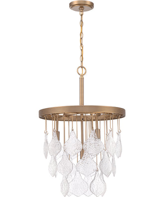 The Vesi 4-Light Pendant in Satin Brass is a stunning blend of elegance and contemporary design. Its exquisite structure features rings of clear textured glass crystals that cascade down, creating a mesmerizing waterfall effect. The satin brass finish adds a touch of sophistication and warmth, making it a perfect centerpiece for any room.