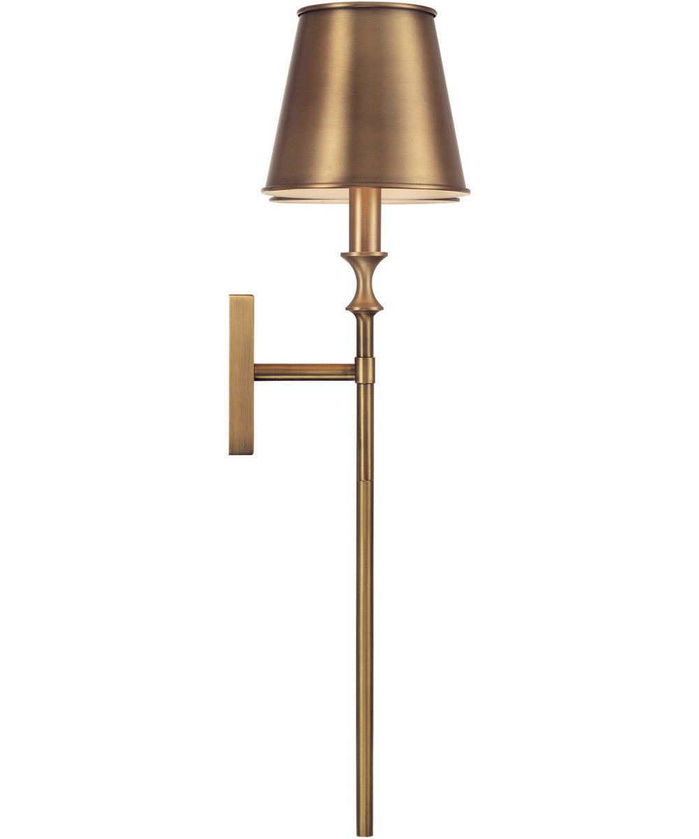 A refresh to the classic silhouette, the Whitney Double Sconce brings elevated glamour to traditional style. The Aged Brass metal shades with white interior create a modern look, while the designer details add intrigue.