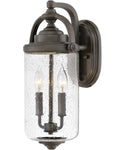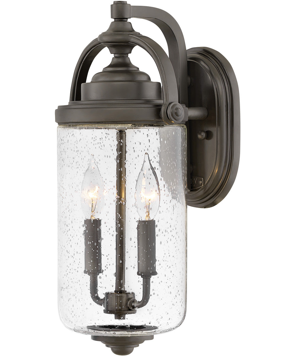 The Willoughby Coastal Elements 2-Light Medium Outdoor Wall Mount Lantern in Oil Rubbed Bronze is a stunning addition to any exterior space. This lantern features a classic, timeless design with a modern twist, making it perfect for both traditional and contemporary homes. The oil-rubbed bronze finish adds a touch of sophistication, while the clear seeded glass shade provides a charming, vintage appeal. The lantern's shape is cylindrical, with a gently curved top and bottom, creating a balanced and harmonious look. The intricate detailing on the metalwork enhances its overall aesthetic, making it a true statement piece.