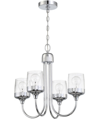 The Wrenn 4-Light Lighting Chrome fixture from Craftmade exudes a minimalist style with beautifully sculpted lines that seamlessly blend with any decor. The chrome finish adds a touch of modern elegance, while the clear glass shades provide a sophisticated contrast. This exquisite chandelier measures 19.25 inches in height and 20 inches in width, making it a perfect centerpiece for various spaces.