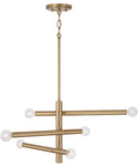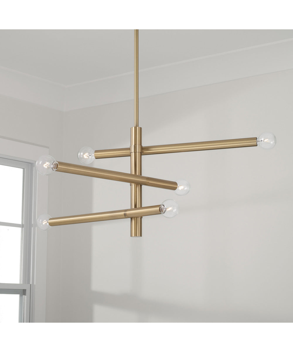 The Zane chandelier features a striking design characterized by its clean lines and geometric form. The six light arms extend outward in a dynamic arrangement, creating a visually appealing structure that draws attention. The warm tone of the Aged Brass finish adds a touch of luxury and sophistication, blending seamlessly with various interior styles, from modern to transitional and even eclectic themes.